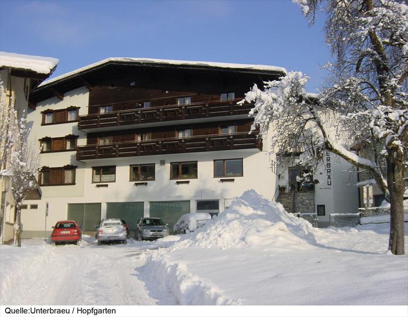 Popis a poloha: jednoduchý, ale příjemný penzion Unterbräu *** v Hopfgartenu leží v centru, cca 400 m od stanice lanovky Salvenbahn. Skibus přímo k lanovce nejede. Klienti z penzionu chodí k lanovce pěšky. Náš autobus parkuje mimo centrum města. Vybavení: k vchodu do penzionu vede 20 schodů, vstupní hala, wi-fi zdarma, jídelna, v 1. patře je posezení. Pro pohodlí doporučujeme lyže a přeskáče uložit ve skidepotu v Intersportu přímo u lanovky - poplatek 7 - 10,50 Euro/3 dny/osoba nebo 10 - 14 Euro/4 dny/osoba. Penzion nemá k dispozici vyhřívanou lyžárnu, pouze prostor v suterénu, kde je možné případně lyže odložit. Zázemí/wellness: za poplatek sauna.