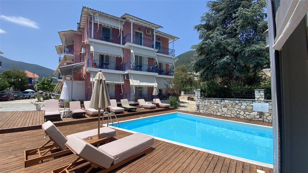 Příjemný rodinný hotel se nachází v letovisku Nidri (Řecko, Lefkada) v klidnějším prostředí přímo u oblázkové pláže s pozvolným vstupem do moře. Hotel spojuje s pláží terasa s příjemným posezením ve stínu slunečníků a s pěknými výhledy na moře a okolní ostrůvky. Lehátka a slunečníky na pláži jsou za poplatek (možno uhradit konzumací v hotelu). Hotel má vlastní bazén, bar u bazénu, restauraci, bar do ulice a venkovní terasu s posezením přímo u pláže. Do centra letoviska a přístavu s mnoha restauracemi a obchůdky dojdete za 5 minut. Návštěvníkům hotelu je k dispozici Wi-Fi zdarma.