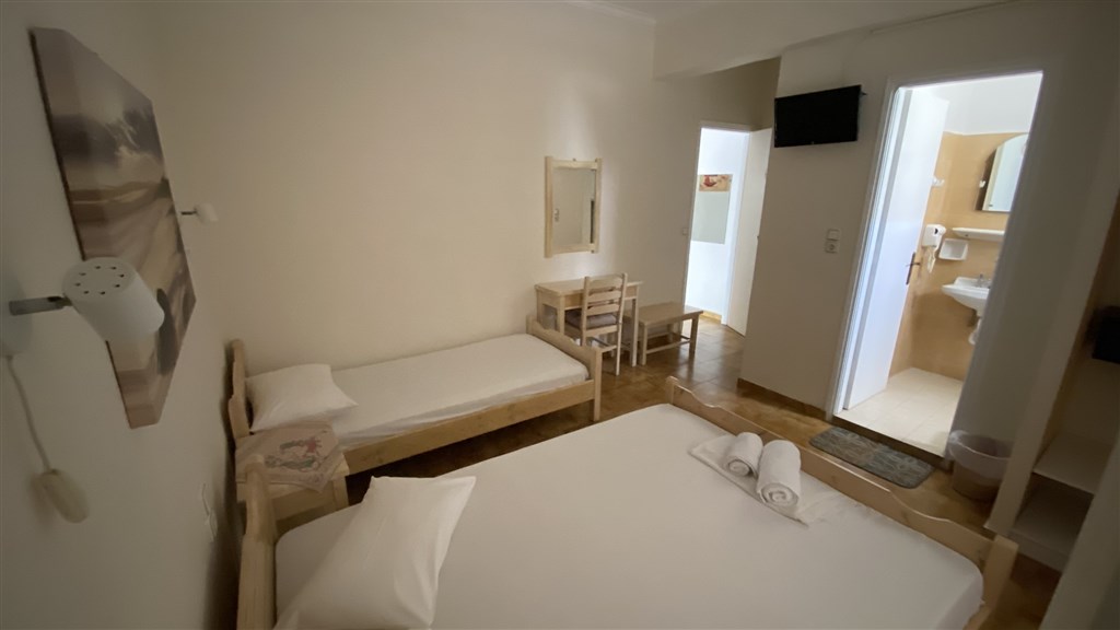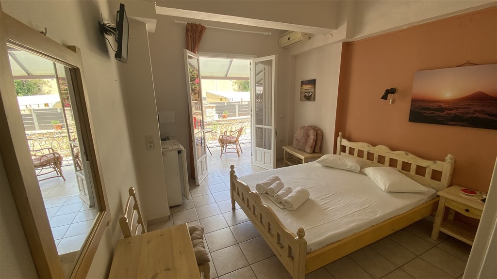 Ubytování je zajištěno v pěkně zařízených dvoulůžkových pokojích, některé s možností přistýlky pro děti i dospělé. Pokoje jsou v přízemí, s vlastní terasou s posezením. V pokojích je klimatizace, lednička, TV, trezor - vše zahrnuto v ceně pobytu. Pokoje mají vlastní sociální zařízení a jsou vybaveny ložním prádlem i ručníky.